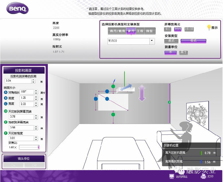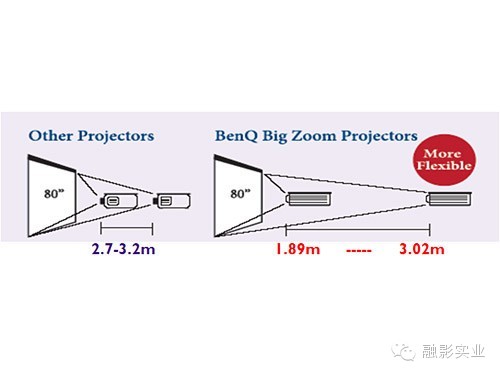 非短焦投影机,投射80英寸即便具备变焦镜头,也需要2.7~3.2米的投射距离;而明基W1500同为投射80英寸,仅需要1.89~3.02米距离。